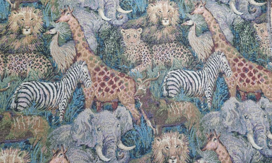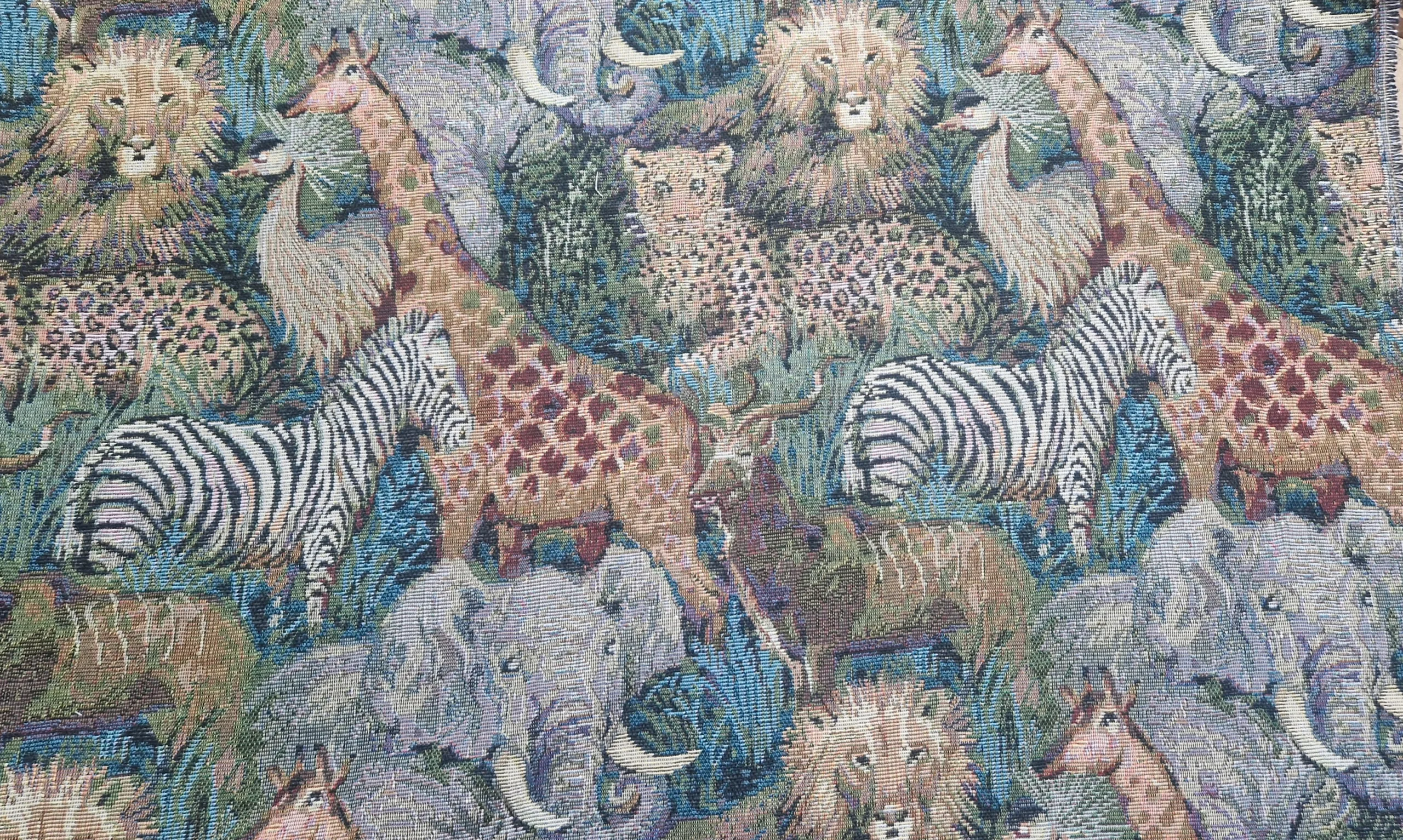 kleurrijk geweven print met leeuwen, giraffen, olifanten en meer. Ideaal voor meubels, tassen en creatieve projecten