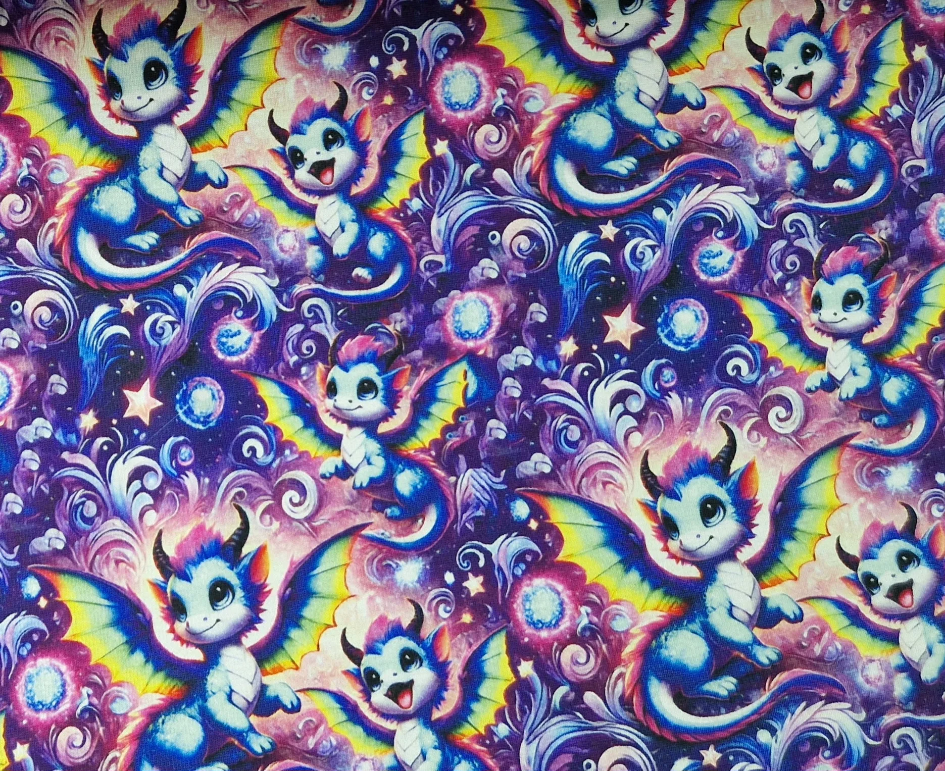 Zachte digitale alpine fleece stof met baby drakenprint. 150 cm breed, ideaal voor warme kleding en accessoires