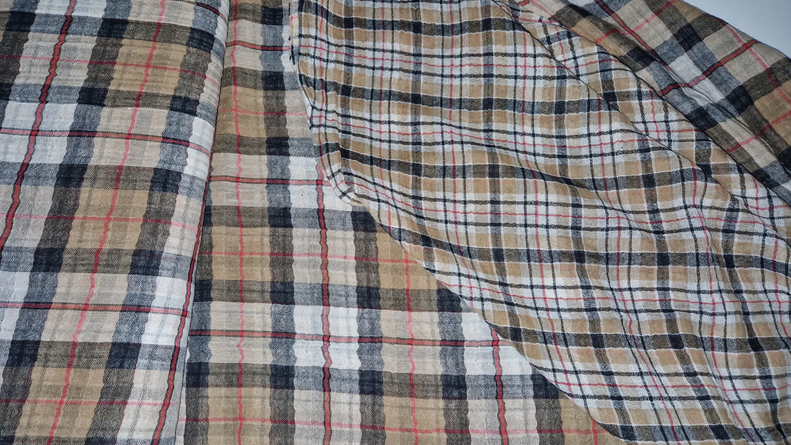 Dubbelzijdige tartan stof van zachte Double Gauze katoen. Ideaal voor kleding, gordijntjes en decoratie. Tijdloze beige ruit en aan beide kanten te gebruiken