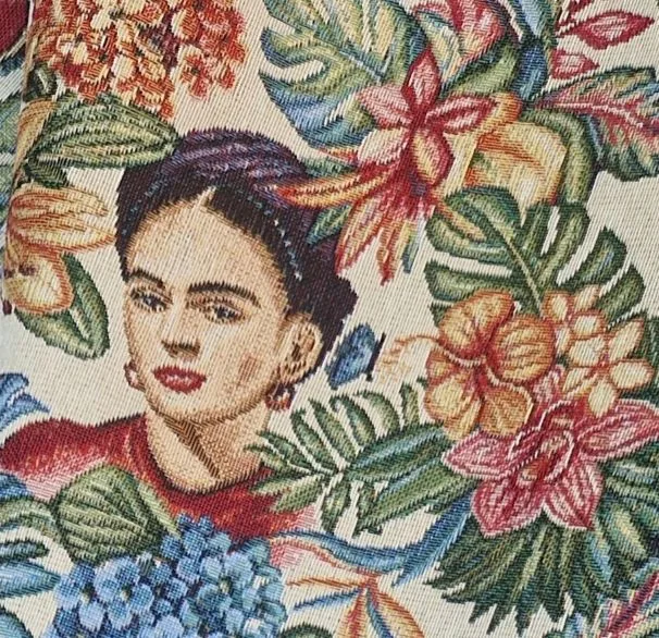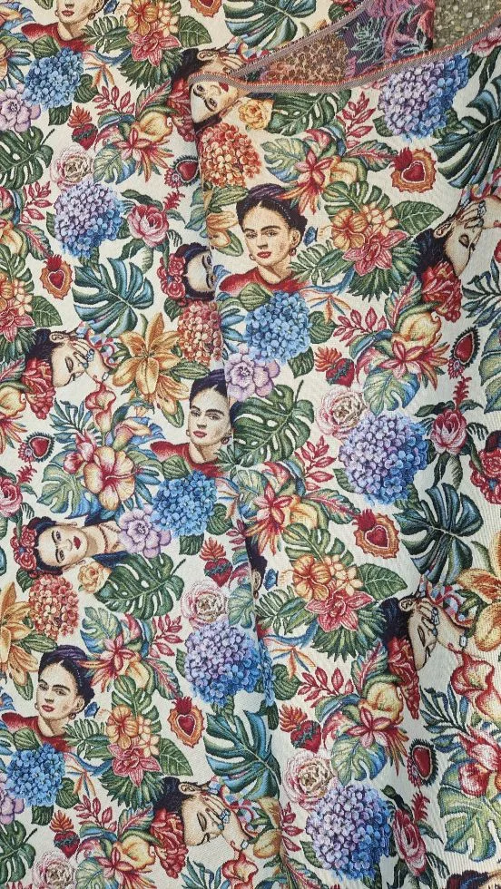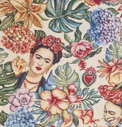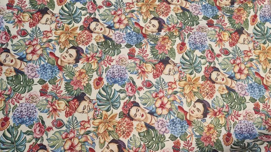 Deze gobelin stof toont een patroon van Frida Kahlo omringd door tropische bloemen en bladeren. De stevige maar soepele kwaliteit zonder stretch maakt de stof geschikt voor tassen, kussens, bekleding en decoratie.