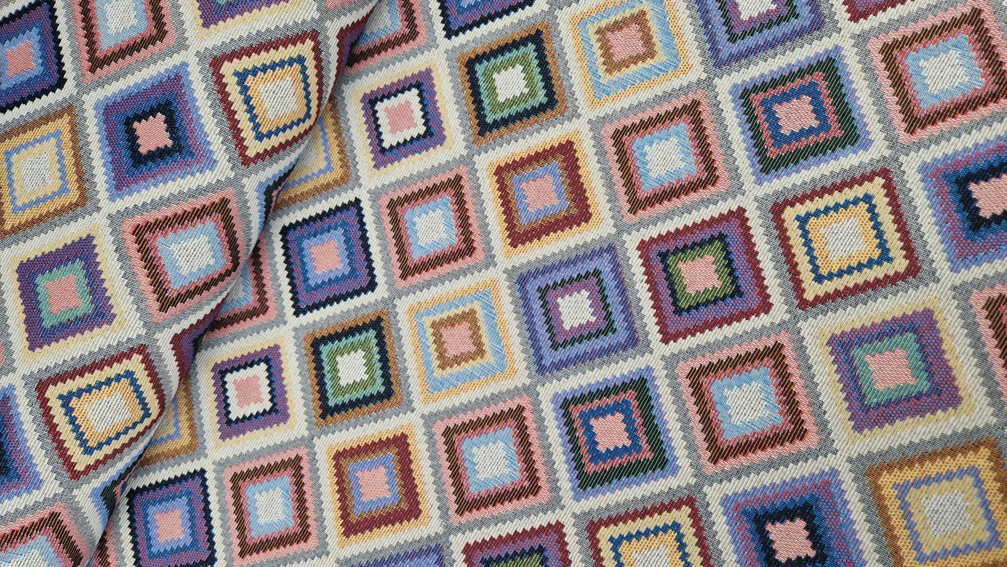 Deze soepel vallende gobelin stof heeft een patroon van meerkleurige ruiten die in lagen over elkaar zijn opgebouwd. De stof bevat geen stretch en is perfect voor tassen, kussens, decoratie en lichte bekleding.