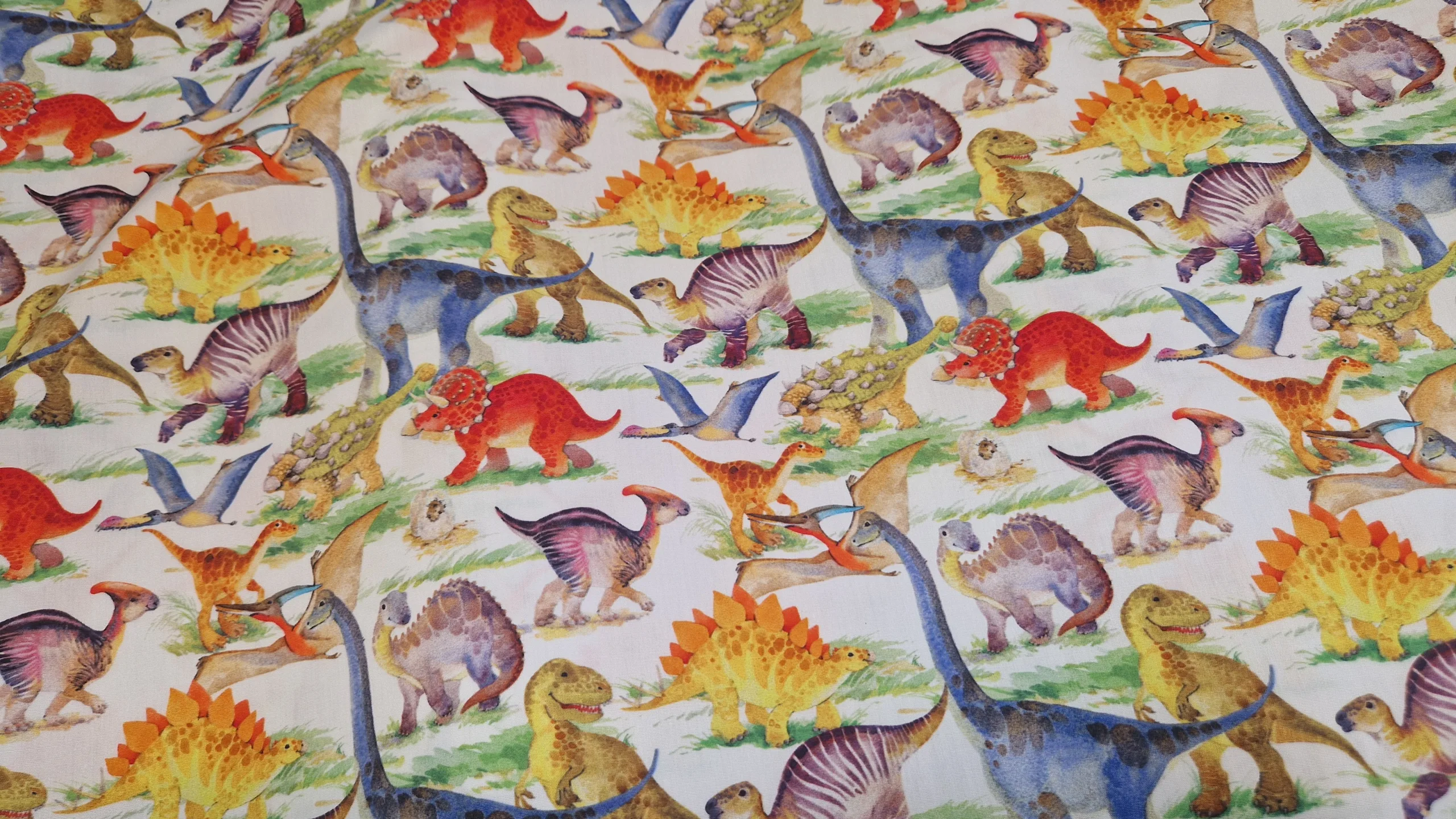 Katoen stof met dino’s in frisse kleuren, ideaal voor kinderkamers, lakens, dekbedden en kleding. De stof is 150 cm breed en voelt zacht en comfortabel aan.