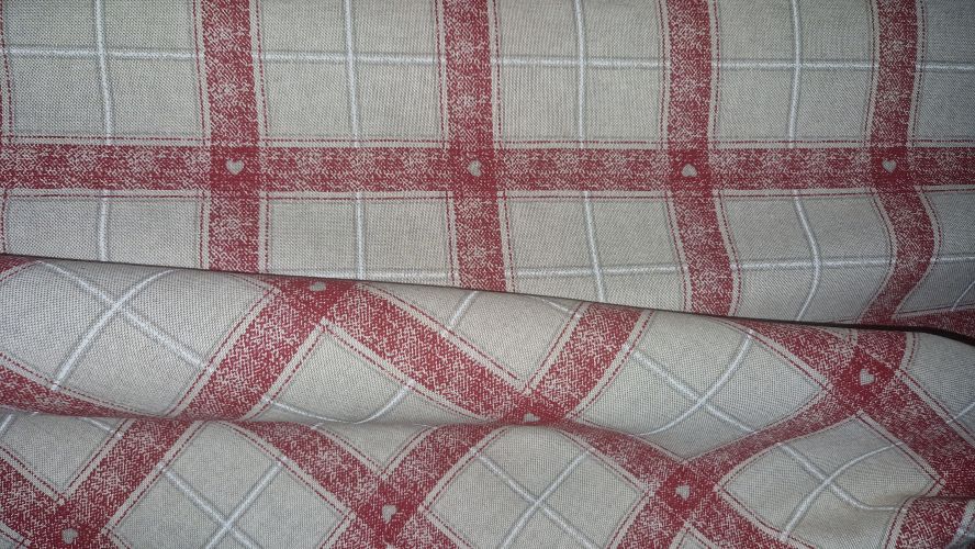 Met een klassiek ruitmotief, rode lijnen en hartjes is hij ideaal voor tafelkleden, kussens, gordijnen of creatieve kerstprojecten.