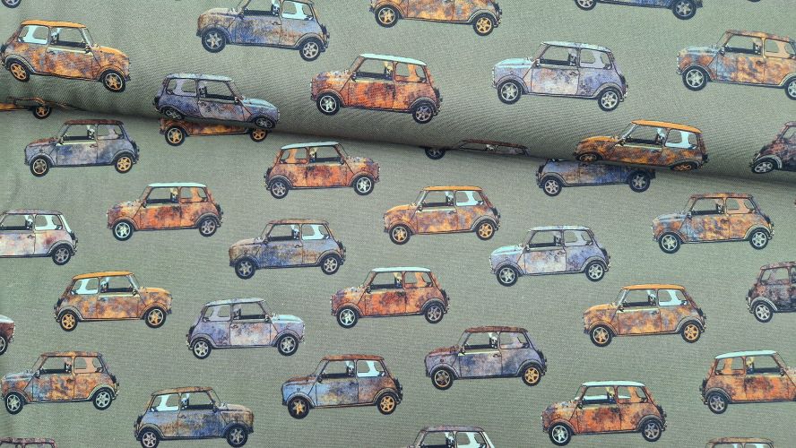 Mini Cooper interieur stof met retroprint – ideaal voor gordijnen, kussens en bekleding in huis of camper of caravan
