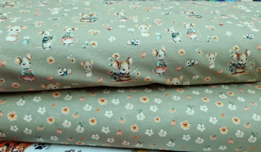 Muisjes tricot zachtgroen lieve print voor babykleding Deze muisjes tricot zachtgroen heeft een zachte groene ondergrond met een speelse print van kleine muisjes, hartjes en subtiele bloemetjes. De rustige kleuren en vriendelijke illustraties geven de stof een warme, lieve uitstraling die perfect past bij baby- en kinderkleding. Daarnaast voelt de stof soepel aan en biedt hij dankzij de rekbaarheid veel draagcomfort. De combinatie van katoen en Lycra zorgt ervoor dat de stof mooi in vorm blijft, zelfs na veelvuldig wassen. Hierdoor is hij ideaal voor shirts, pyjama’s en andere comfortabele kledingstukken voor kinderen.