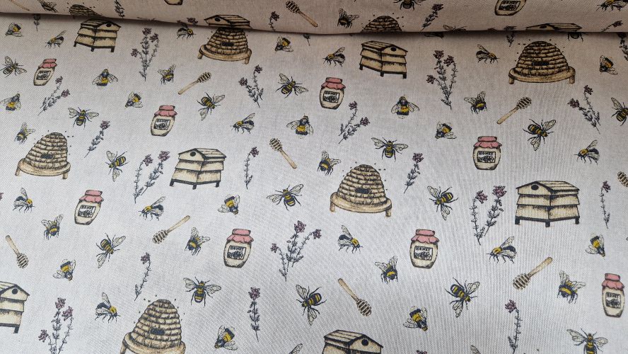 Ideaal voor tassen, kussens, schorten en decoratie. De print toont bijtjes, honingpotjes, bijenkorven en lavendel op een warme beige achtergrond.