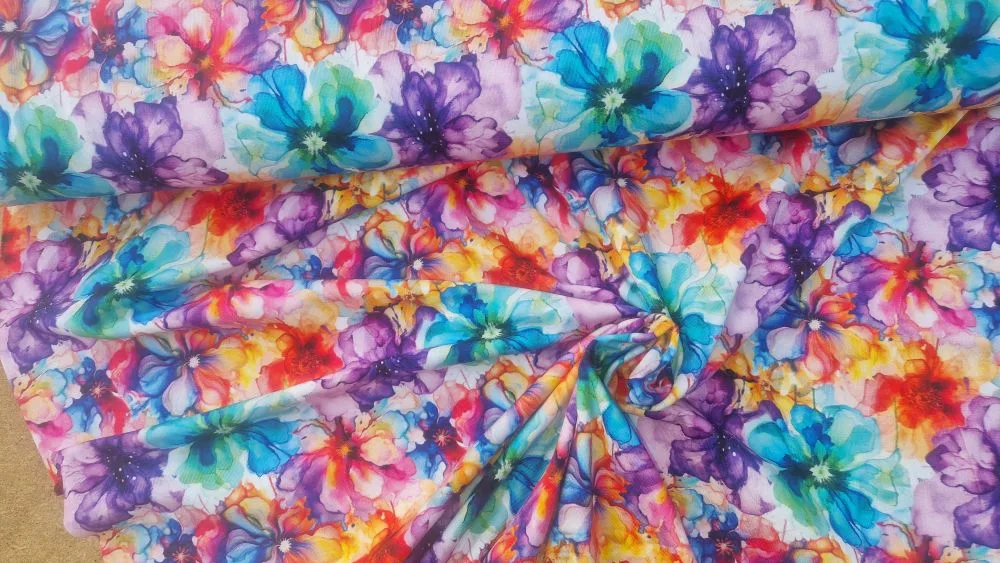 Deze tricot kwaliteit bestaat uit 95% katoen en 5% elastaan, waardoor de stof soepel valt en prettig draagt. De kleurrijke bloemenprint geeft elk kledingstuk een frisse en vrouwelijke uitstraling.