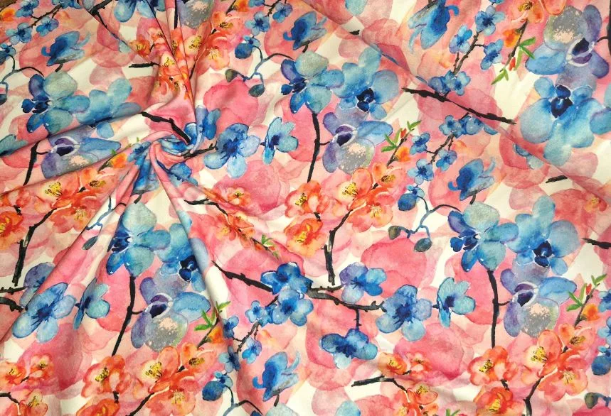 Tricotstof blauwe orchidee met elegant bloemenmotief. Zachte, rekbare kwaliteit voor jurken, blouses, rokken en stijlvolle damesmode.