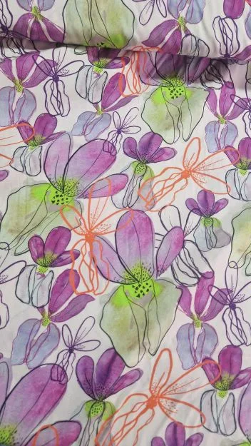 Viscose bloemenstof soepel vallend en kleurecht Stof met kleurrijke bloemenprint in paars, groen en oranje. Soepel vallend, kleurecht en 150 cm breed. Perfect voor jurken, blouses, rokken en luchtige zomerbroeken. Viscose bloemenstof. Zomerse, soepel vallende stof voor damesmode en vakantie‑outfits. Deze viscose bloemenstof is luchtig, soepel en kleurecht. De print bestaat uit grote bloemen in paars, groen en oranje. Sommige bloemen zijn gevuld met aquarelachtige tinten, andere zijn alleen omlijnd. De stof valt mooi en beweegt elegant mee met het lichaam. Viscose is ideaal voor zomermode. De stof is ademend, zacht en prettig in gebruik. Dankzij de breedte van 150 cm is ze geschikt voor allerlei dameskleding. Denk aan jurken, blouses, rokken en wijdvallende broeken. Ook perfect voor vakantie‑outfits en dagelijkse zomerlooks. De stof toont een drukke bloemenprint met grote bloemen in paars, groen en oranje. Sommige bloemen zijn gevuld met zachte kleuren, andere zijn omlijnd in zwart. De bloemen overlappen elkaar en vormen een levendig geheel. De achtergrond is licht en neutraal. De stof valt soepel en heeft een elegante glans. De print oogt artistiek, zomers en vrouwelijk. Eigenschappen van Viscose bloemenstof soepel vallend • 100% viscose • Breedte: 150 cm • Soepel vallend en kleurecht • Grote bloemenprint in paars, groen en oranje • Zacht, ademend en comfortabel Toepassingen • Jurken en blouses • Rokken en zomerbroeken • Tunieken en kimono’s • Vakantie‑outfits en dagelijkse mode • Creatieve damesprojecten Bekijk hier meer leuke dames stoffen https://makomastoffen.nl/winkel/?filters=product_cat[175] “Volg Makoma Stoffen op Facebook voor nieuwe stoffen, aanbiedingen en inspiratie.” https://www.facebook.com/Makomastoffen/