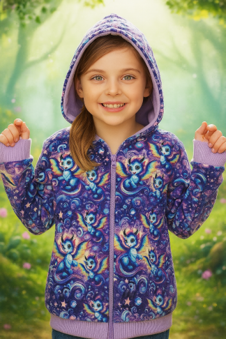 Hoodie van digitale alpine fleece stof met baby drakenprint. Zacht, warm en perfect voor kinderkleding.