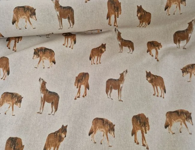Wolven interieur stof met een gedetailleerde print van huilende wolven in een natuurlijke setting. Ideaal voor woondecoratie, bekleding en creatieve interieurprojecten.